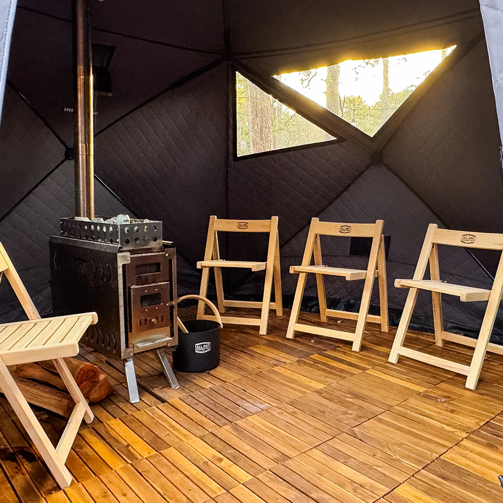 Includes setup of 6 person sauna tent, wood stove, firewood, seating for 6 and user orientation.